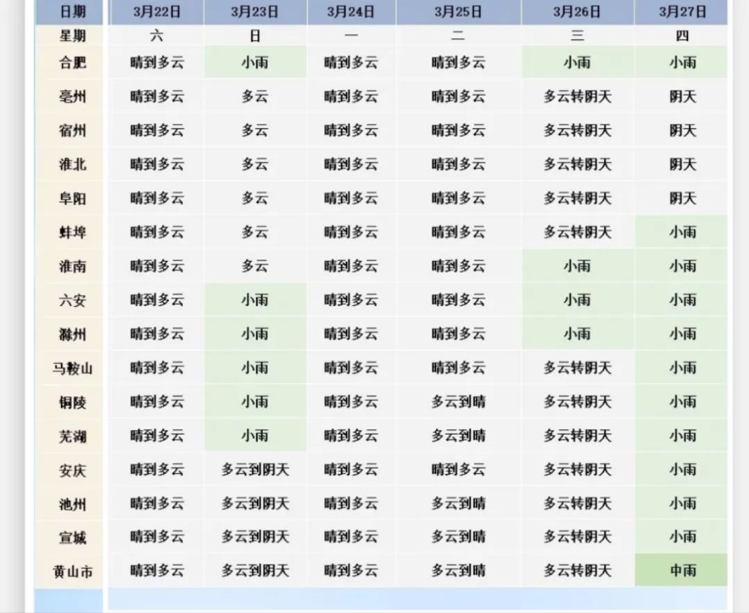 23日(周日):淮北地区阴天;淮河以南多云至阴天,江淮南部及临江部分地区有小雨。