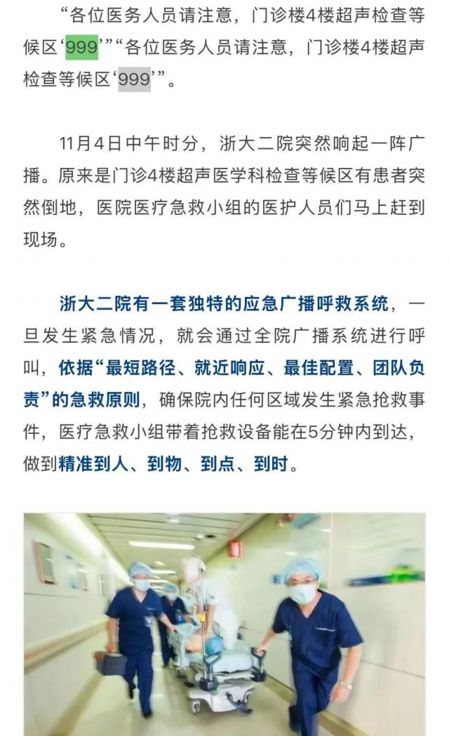 以浙江大学医学院第二附属医院为例,在该院拥有独特的应急广播求救系统,在医院内进行应急演练或抢救病人时,应使用相关紧急代码。" 999 “这意味着一些患者患有心脏骤停,或者医院正在进行急救演练。不同的代码会在不同的情况下使用,与普通公众无关,公众也不需要记住相关的数字。