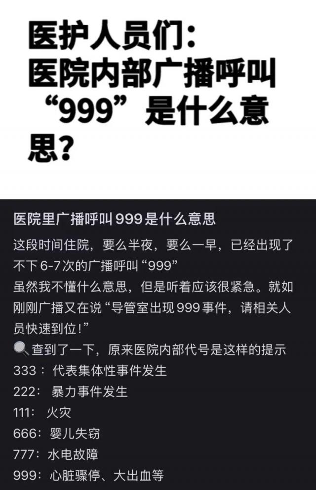 发帖人强调“医院广播播放”" 111、222、333、666、999 "它们都有特殊的含义,一旦在医院听到广播里播放相应的数字,就必须立即离开现场。