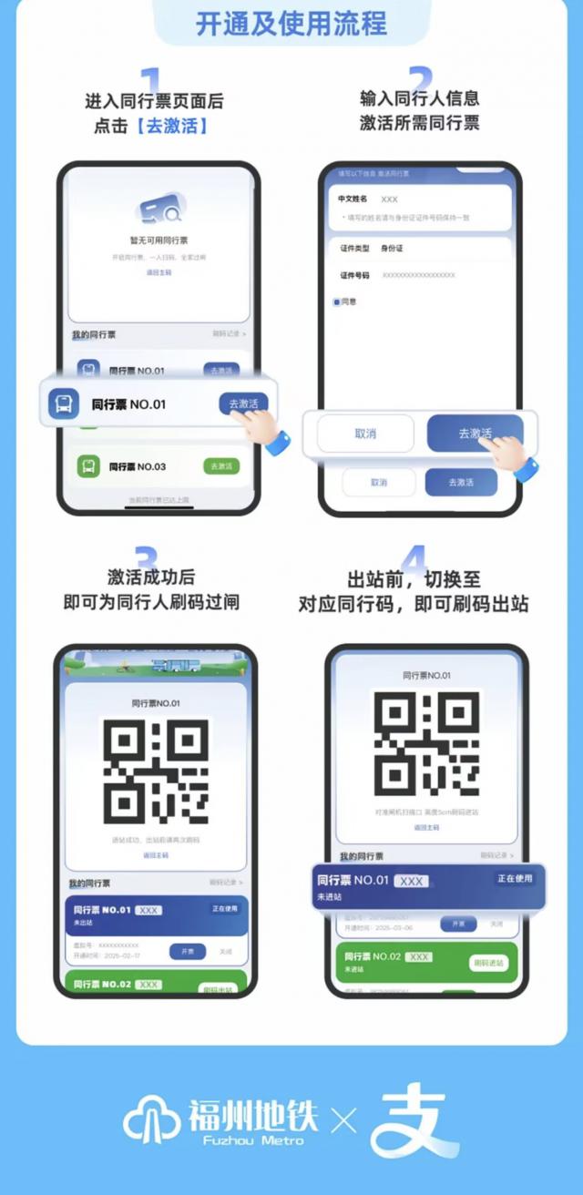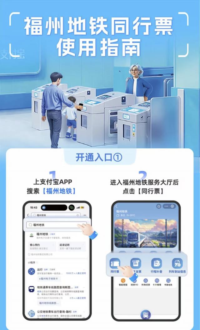据官方介绍,客户可以打开支付宝,搜索“福州地铁”,点击“同行票”。之后可以激活相关功能,多人一起支付公交费用,也可以在公交码小程序中查询行程费用。