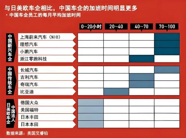 不久前,美国咨询公司艾睿铂发布了一份关于加班时间的报告,比较了汽车行业员工每月的平均加班时间。数据显示,比亚迪每月的加班时间是多少? 20~40 吉利汽车为小时 40~70 小时。新兴的纯电动汽车公司,如蔚来汽车,实现了 70~100 一个小时,“卷王式”的工作文化正在渗透。相反,德国大众和丰田的中国法人只是 0~20 小时。