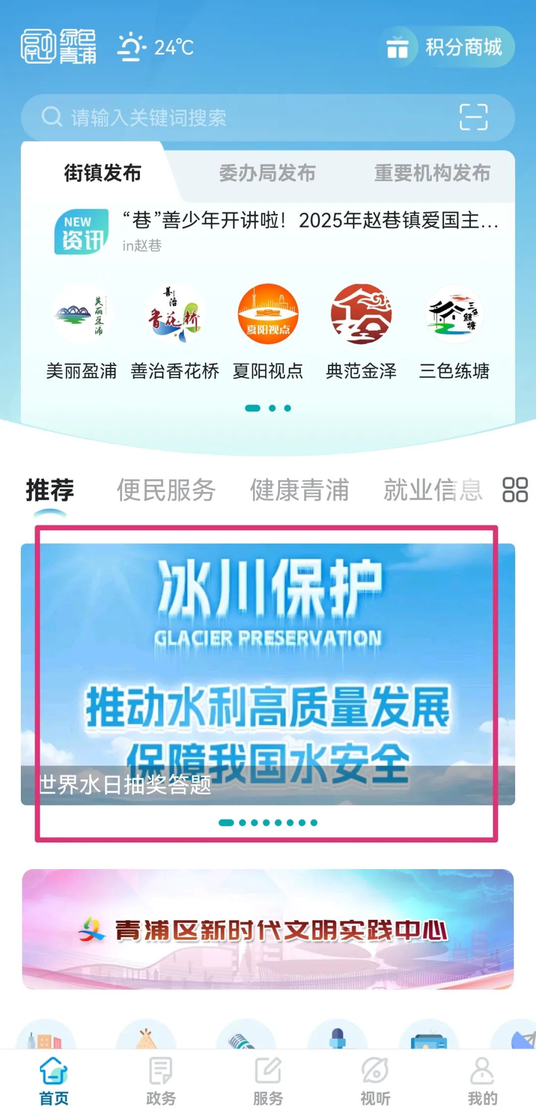 1、开启“绿色青浦”APP,点击主页上的活动banner,如下图红框所示,点击查看即可参与活动。
