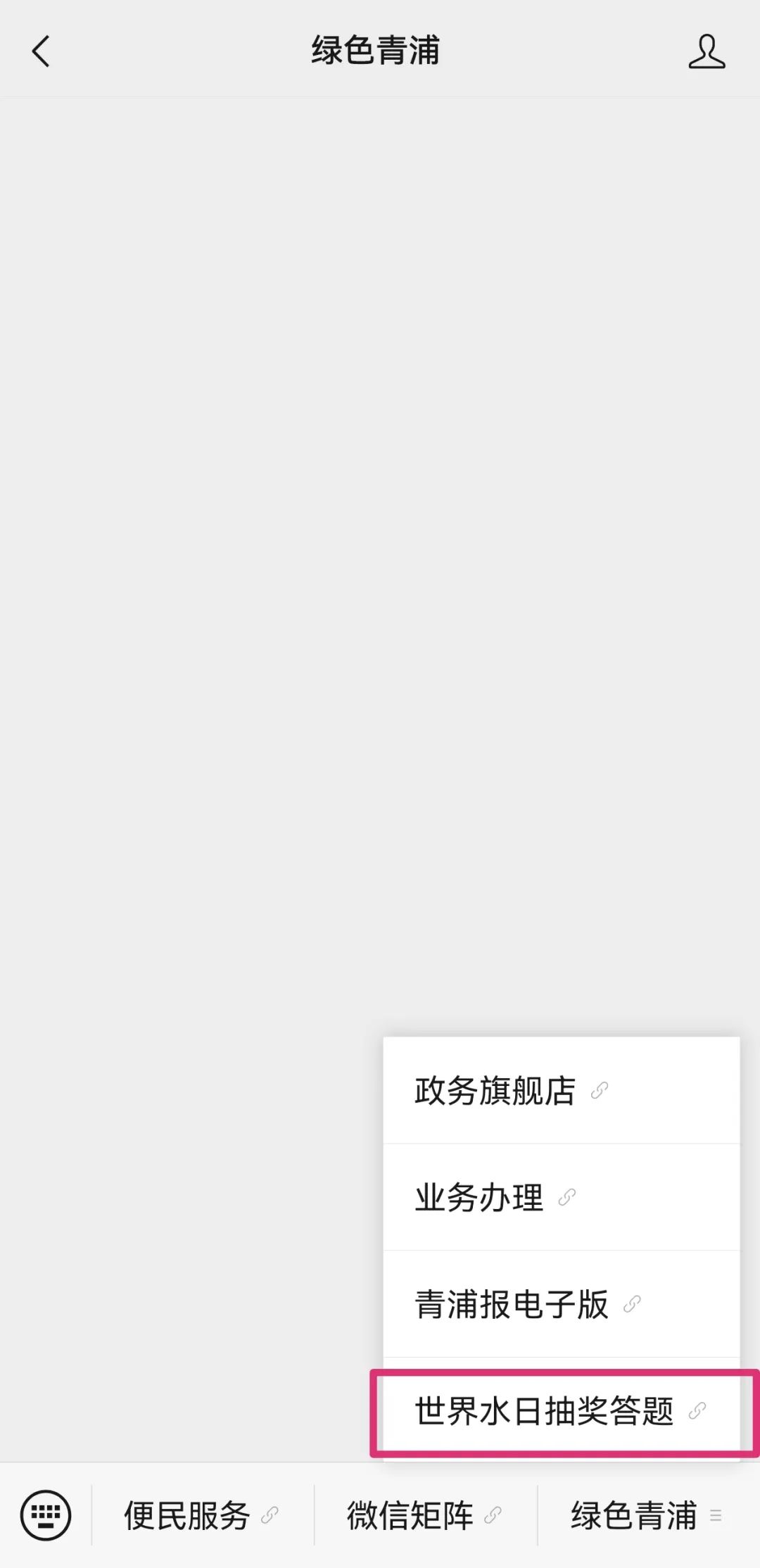 2、打开“绿色青浦”微信微信官方账号,进入主页,点击右下角“绿色青浦”,点击“世界水日抽奖解题”参与活动。