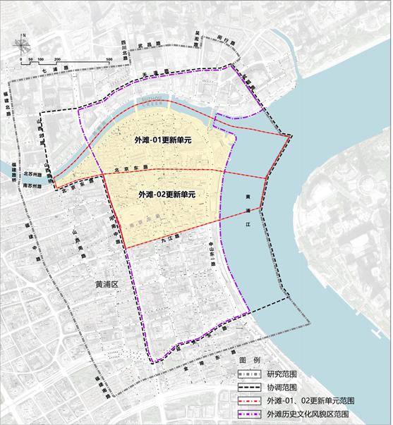 根据实施方案,本次更新单位范围包括:外滩-01-北至苏州河、东至黄浦江、南至北京东路、西至山西南路,面积约为 35.75 公亩。外滩-02更新单位-北至北京东路,东至黄浦江,南至九江路,西至河南中路,面积约为 27.79 公亩。