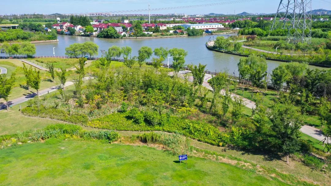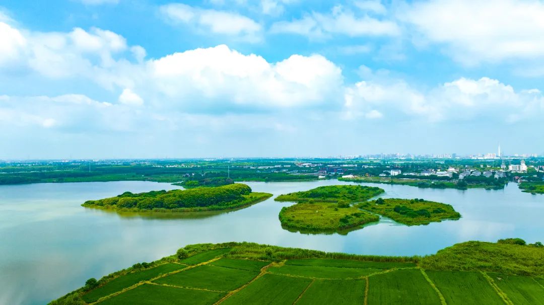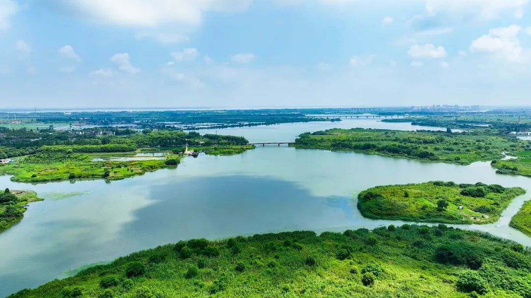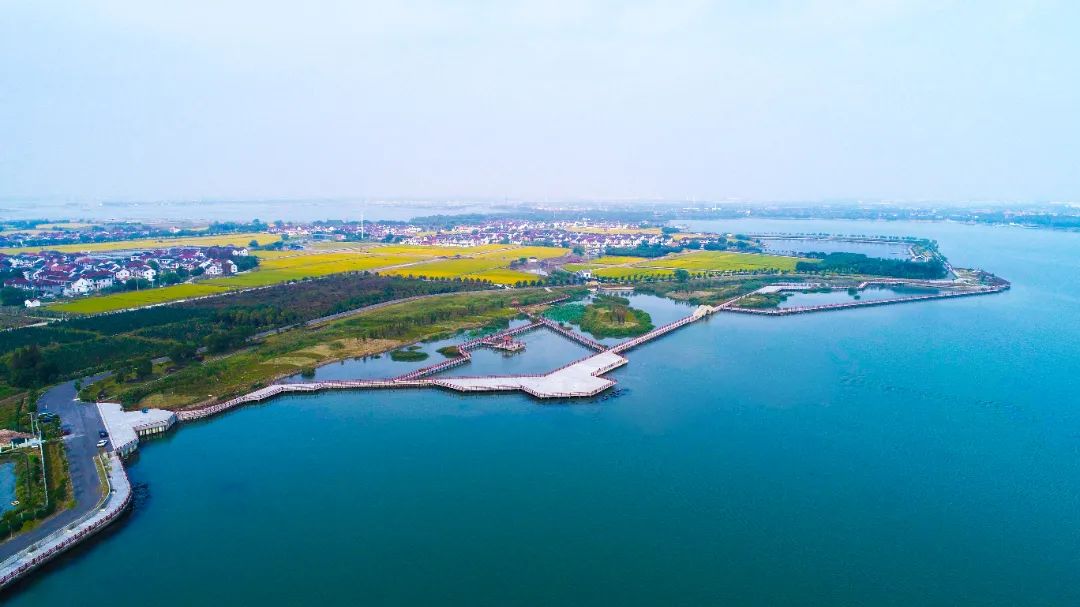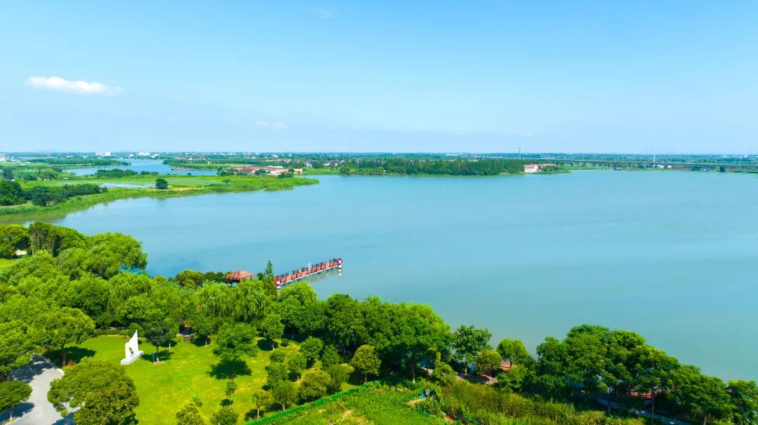 “蓝珠链”很有匠心,水系串联“七湖一河”(七湖:火泽荡、南白荡、西白荡、大漾、小漾、大莲湖、任屯湖;一河:北横港),像“大珠小珠落玉盘”一样点缀地面。