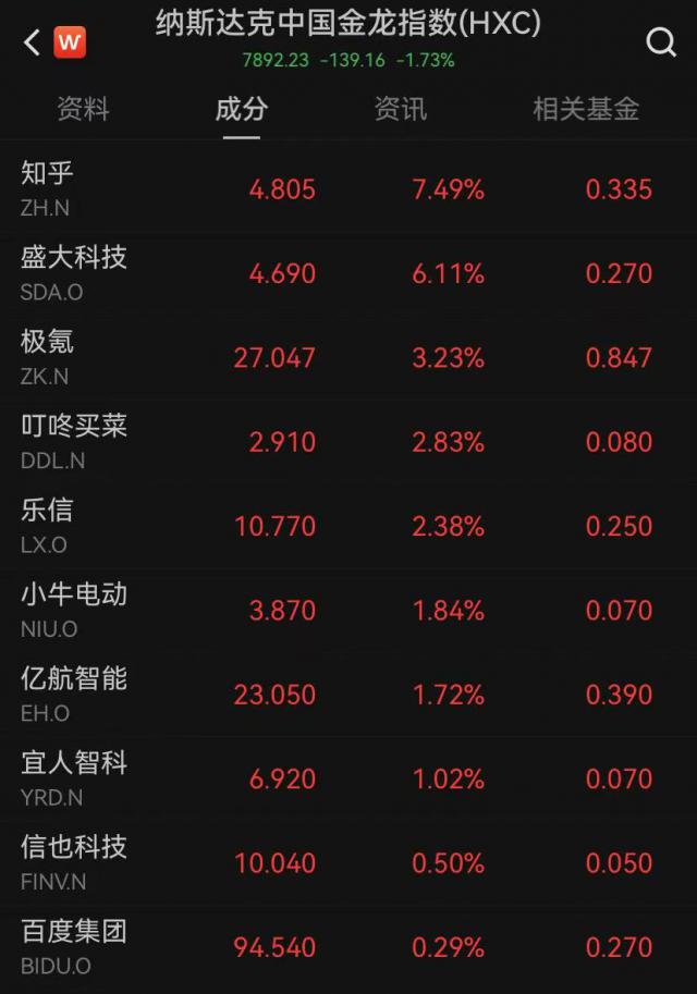 大部分热门中概股下跌,中国金龙指数在纳斯达克下跌 1.73%,连续四天下跌,本周累跌。 2.31%。