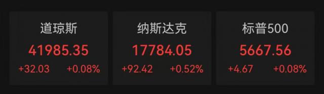 美东时间星期五,美股三大指数小幅收涨。,道指涨 0.08% 报 41985.35 点,标普 500 指数涨 0.08% 报 5667.56 点,纳指涨 0.52% 报 17784.05 点,标普和纳指双双结束了周线四连跌。