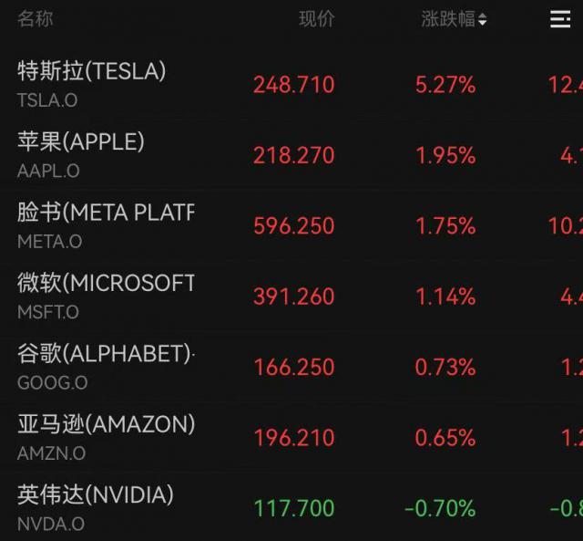 大科技股大多收涨,苹果上涨。 微软上涨1.95% 英伟达1.14%下跌 亚马逊上涨0.7% 0.65%,谷歌 C 涨 0.73%,Meta 涨 博通1.75%上涨 0.59%,特斯拉涨 5.27%,市值一夜暴涨。 400 十亿美元(约合人民币) 2903 亿元)。马斯克鼓励员工“抓住”特斯拉股票,称公司的未来非常光明。