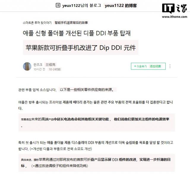 韩国新闻聚合帐号" yeux1122 "在 Naver 在博客上,苹果正在发布第一个折叠屏幕的消息。 iPhone 显示驱动集成电路的使用(DDI)进行精细化调整,旨在实现设备整体更轻薄的设计。DDI 其主要功能是将设备Cpu发出的模拟信号转换成控制显示像素所需的模拟信号,这是一个关键部件。对 DDI 改进能使面板部件更加纤细。,对于拥有多个显示屏和紧凑空间的折叠手机来说,同时减少设备的热量输出,减少电量消耗是非常重要的。