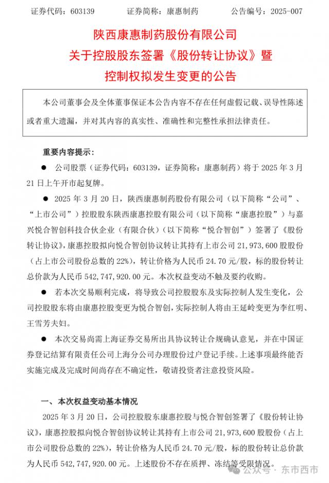 3 月 20 当天晚上,康惠制药宣布,公司控股股东陕西康惠控股有限公司(以下简称“康惠控股”)与嘉兴悦合智创科技合伙企业(以下简称“悦合智创”)签订了《股份转让协议》,康惠控股拟将其上市公司转让给悦合智创协议。 2197.36 万股,占总股本的万股。 转让价格为22% 24.7 元 / 股,总价款 5.43 亿元。