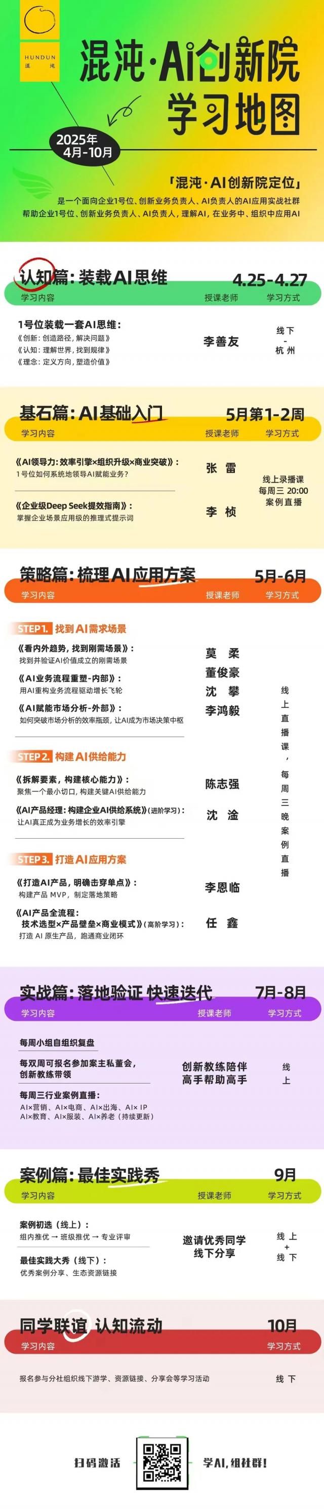 在混沌 · AI 创新学院还是一如既往的用心跑,但不同的是跑得更深,周期更持久,半年的学习周期,全程的互动设计,只是为了让生意真正落地!