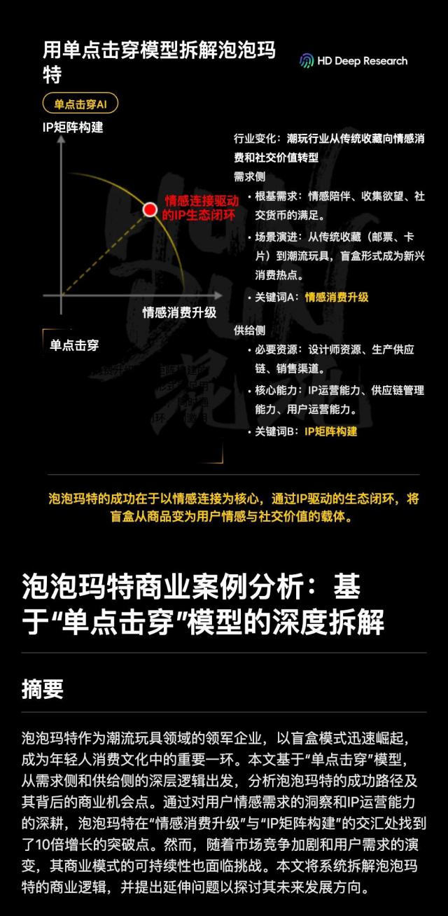 混沌把 10 一年一度积累的商业认知体系转化为 AI 训练数据,例如,用单点穿透分析泡泡玛特的方法,10 秒生成详细的报告,这是前一个月的研究工作!例如,你必须开一家茶叶店,这个 AI 不但要告诉你选址公式,还要用“错位竞争”模型来帮助你设计生存策略。