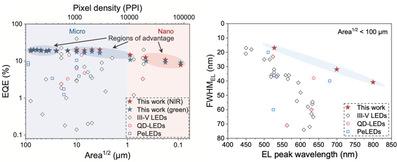 狄大卫说:“文章中显示的 nano-PeLED 最小可达到 90 纳米,是迄今为止报道的最小报告。 LED 像素。"