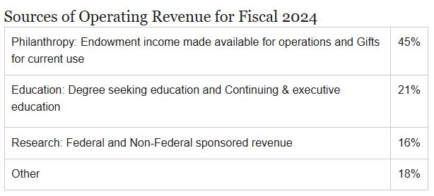 2024 财年结束后,与去年相比,哈佛大学的总营业收入增加了 6%(3.75 亿美元),达到了 65 亿美金。收入主要依赖于富裕的学生。 or 有钱人捐赠,学校设立的捐赠基金收入和学费,科研收入等等。