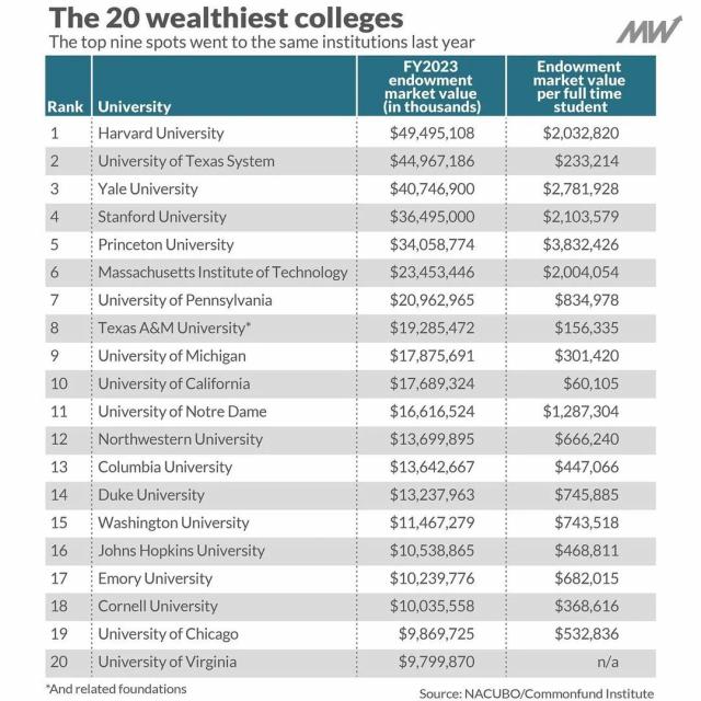 身为美国精英大学的老大,"富有"毫无疑问,它是哈佛大学的一个关键词。简单看一下。 NACUBO 统计的2024 一年中最富有的美国大学 Top 20,同时,哈佛也稳居榜一。