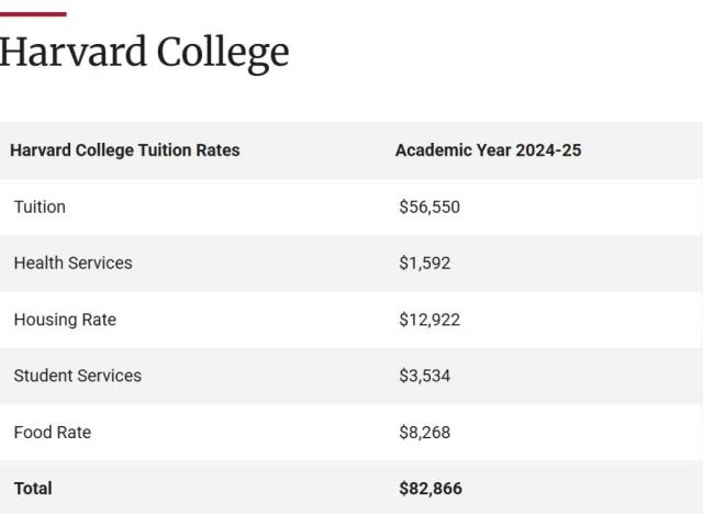 哈佛作为“常春藤盟校招牌”,在美国的学费也遥遥领先:根据公开数据,哈佛每年本科学费的平均水平高达 56,550 美金,加上各种杂费之后,将会达到 82,866 美元水平。