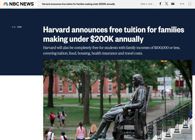 从 2025-2026 哈佛将从学年开始所有家庭的年收入都在 20 一万美元以下的学生,免学费!