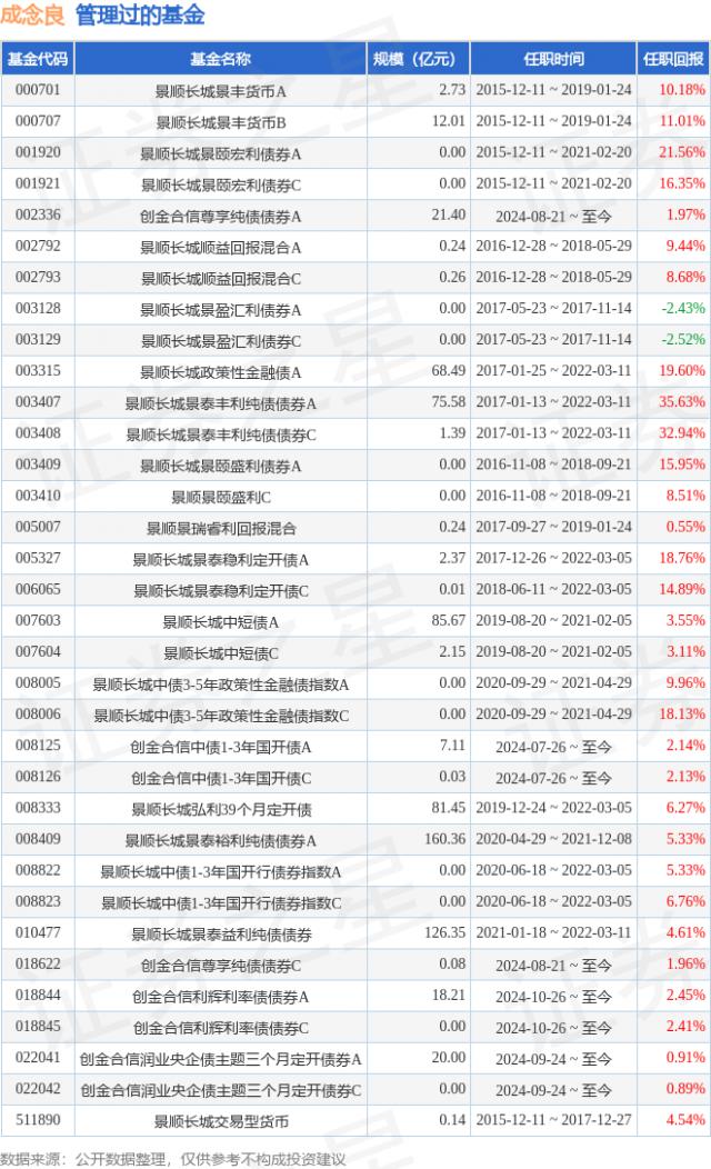 成念良先生:中国国藉,北京理工大学硕士。曾担任大公国际信用评级有限公司评级部高级信用分析师、平安大华基金投资研究部信用研究员、专户业务部投资经理。2007 年 7 2009年加入北京嘉源置业投资有限公司,任投资策划部投资分析师。 年 7 2012年加入大公国际信用评估有限公司,担任评级部高级信用分析师 年 7 2015年加入平安大华基金管理有限公司,曾任投资研究部信用研究员、专户业务部投资经理, 年 9 每月加入景顺长城基金管理有限公司,作为固定收益部门的基金经理,曾于 2017 年 5 月至 2018 年 3 月管理景顺长城景盈汇利债券投资基金基金基金 ;2015 年 12 月至 2018 年 3 月度管理景顺长城交易型货币市场基金 ;2016 年 12 月至 2018 年 5 月度管理景顺长城顺利回报混合型证券投资基金 ;2016 年 11 月至 2018 年 12 月度管理景顺长城景颐盛利债券投资基金基金 ;2015 年 12 月至 2019 年 1 月度管理景顺长城景丰货币市场基金 ;2017 年 9 月至 2019 年 1 景顺长城景瑞瑞利月管理定期开放混合证券投资基金。景顺长城景顺长城景顺长城宏利债券投资基金、景顺长城景泰丰利纯债券投资基金、景顺长城政策性金融债券投资基金、景顺长城宏利 39 债券型证券投资基金每月定期开放。曾任景顺长城中短期债券型证券投资基金、景顺长城景泰裕利纯债券型证券投资基金主管、景顺长城中短期债券型证券投资基金 1-3 中国发展银行债券指数证券投资基金主管、景顺长城政策性金融债券投资基金、景顺长城景泰丰利纯债券投资基金、景顺长城景泰丰利纯债券投资基金、景顺长城景泰稳定定期开放债券投资基金主管。曾经是长城弘利的景顺 39 债券型证券投资基金基金主管每月定期开放。曾经是长城弘利的景顺 39 债券型证券投资基金主管每月定期开放。2022 年 3 2024年加入汇华金融有限公司,任投资部多资产资产配置高级经理, 年 6 每月加入创金合信基金管理有限公司,现任投资主管、基金经理利率和衍化投资部门。现在的创金合信中债 1-3 年国开行债券指数证券基金、创金合信享受纯债券型证券投资基金主管。2024 年 9 月 24 日起担任创金合信润业央企债主题三个月定期开放债券型证券投资基金主管。2024 年 10 月 26 日本创金合信利辉利率债券型证券投资基金基金主管。2025 年 1 月 22 创金合信尊宏债券型证券投资基金基金主管日起任职。