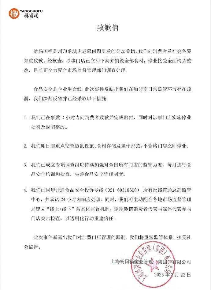 3月22日,杨国福正式发布道歉信,回应杨国福苏州印象城店老鼠问题,称“经核实,涉案门店已立即下架并销毁所有食材,停业接受全面消毒整改。目前,他们正在全力配合市场监督管理部门进行调查和处理。”