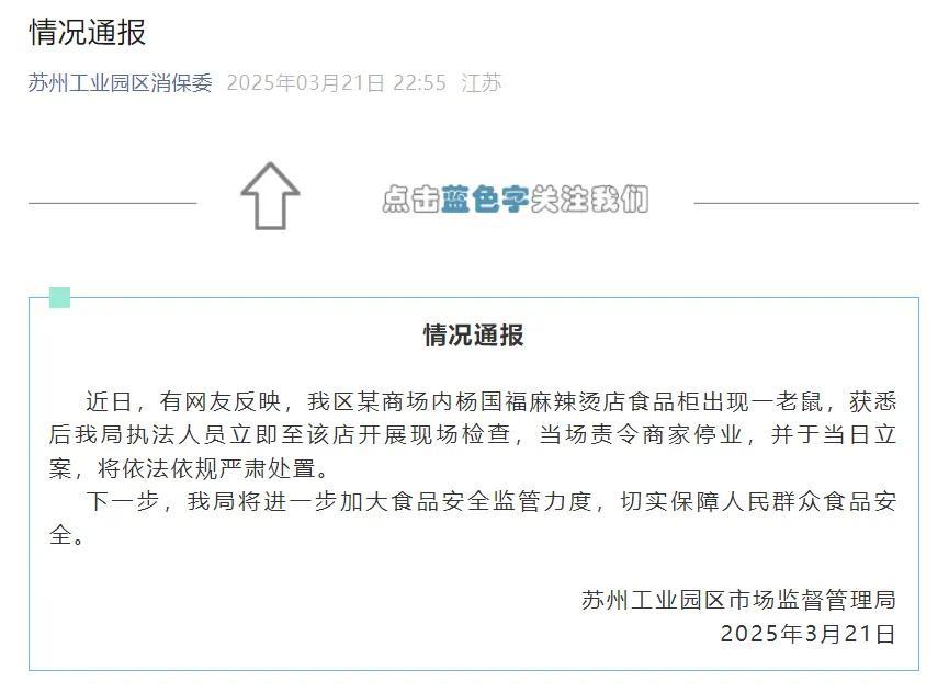 3月21日晚,苏州工业园区市场监督管理局发布情况报告:近日,有网友反映,我区某商场杨国福麻辣烫店食品柜内出现一只老鼠。得知此事后,我局检查人员立即前往该店进行监督检查,当场命令商家停业,当天立案,将依法严肃处理。