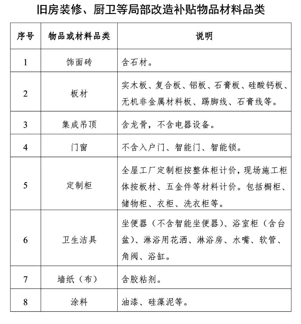 个人消费者选择装修旧房(2023年1月1日前竣工验收合格房屋)、厨卫等部分装修所需的装饰砖(含石材)、板材(包括地脚线、石膏线)、集成吊顶(不含电气设备)、门窗(不含入户门、智能门、智能锁)、定制橱柜,卫浴用具(不含智能马桶)、墙纸(布)、涂料(包括油漆)等物品和材料。