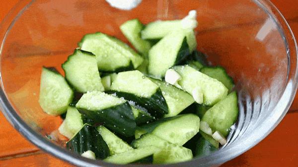 1. 将黄瓜洗净不去皮切成滚刀块,倒入一勺盐渍。 20 分钟出水。