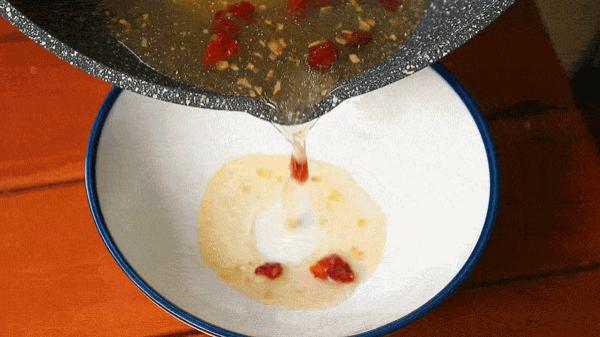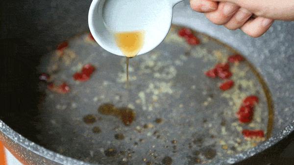 4. 将姜片和干辣椒切成粉末,将油倒入热锅中,然后倒入一小碗清水。