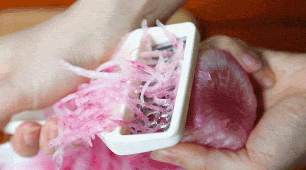 2. 将心中美丽的萝卜洗净去皮,用刨子刨成萝卜丝,放入适量的盐腌制一段时间,然后挤去水备用。