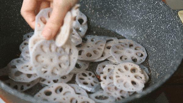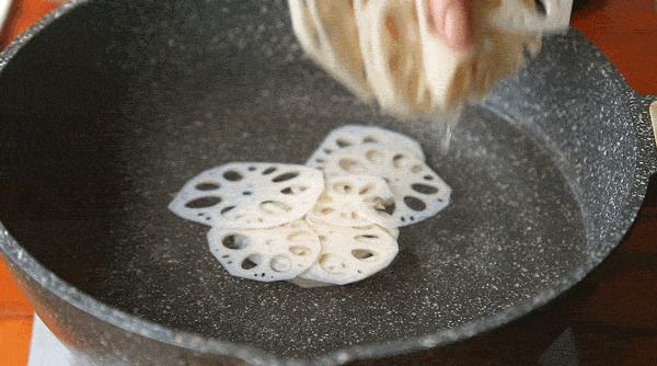 6. 将冷莲藕片放入,文火搅拌,让每一片莲藕片都沾上糖醋汁。