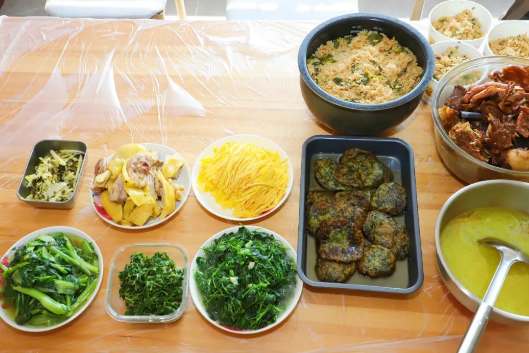 朱阿姨又做了草头,炉子快速翻炒,加入蒜叶,瞬间刺激了草头的鲜嫩,叶子像翡翠一样明亮。满满一桌“春宴”,除了春菜,还有孩子们最喜欢的炒糖芥菜塌饼,还有自己摊的蛋皮,红烧鹅和雪菜,让人胃口大开。