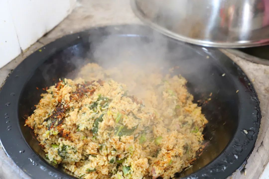 老灶烧柴,等铁锅烧到烟雾微微升起,把肥瘦相间的咸肉片炒至变色,加入切成段的菜心翻炒,然后加入提前浸泡半小时的米饭,最后加入“灵魂”酱油,盖上。等待二十分钟,肉香酱香混合青菜鲜甜的炉饭便大功告成,米粒吸收了油脂和蔬菜汁,变得晶莹剔透。假使爱吃锅巴,那就再烧一会儿,焦香锅巴“咔嚓”直响,是令人怀念的童年味道。
