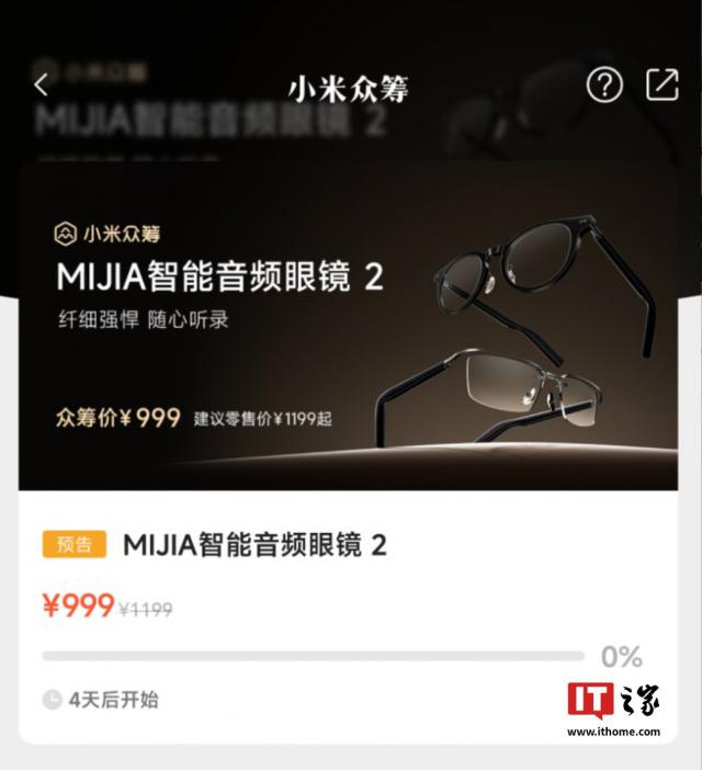 IT 世家 3 月 22 昨天晚上,小米悄悄上架了小米众筹平台。 MIJIA 智能化音频眼镜 2,主推 5mm 镜腿、27.6g 机身、12 每小时不断听续航,标准价格 1199 元,众筹价 999 元,但是现在官方又下架了这个产品。