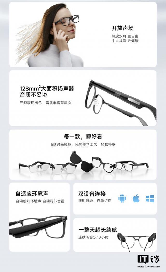 作为比较,IT 这个家族知道小米的第一代 MIJIA 智能音频眼镜有五种款式:飞行员模式、方形半框模式、方形全框模式、圆形全框模式和太阳镜模式。它的外观是 NCVM 真空镀膜工艺,镜框采用自研铰链设计,眼镜的整体重量 38.1 克。