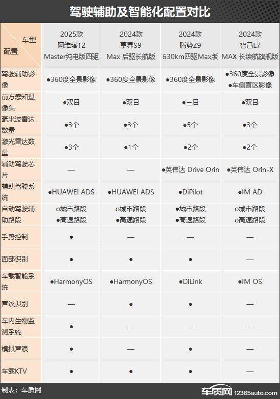 驾驶员辅助硬件配置方面,腾势 Z9 性能最好,它配备了三个目前的感知摄像头,并且毫米波雷达也配备了 5 个,组合英伟达 Drive Orin 辅助驾驶芯片,支持城市和高速公路自动驾驶辅助。阿维塔 12 和享界 S9 标配高速公路路段自动驾驶辅助,但城市道路需要通过选择才能获得。相比之下,最糟糕的表现是智己。 L7,虽然硬件配置还可以,但是原厂的自动驾驶辅助功能并没有配置,只是提供了选择机会。
