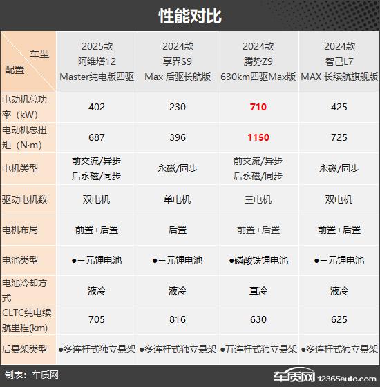 动力方面,四款车中只有享界。 S9 配备后置单电机,腾势 Z9 选用外置 后三台电机的组合,另外两款车型都是外置的 后置双电机布局。性能参数部分,腾势 Z9 电动机总功率为 总扭距达到710kW 1150N · m,远远领先于其它三款车型。另外,它还配备了比亚迪经典的磷酸铁锂刀片电池,不过 CLTC 只有纯电续航里程 630km,仅略优于智己。 L7。在电池寿命方面,配备后置单电机的享界 S9 优势明显,官方公布 CLTC 达到纯电续航里程 816km,足以消除车主里程焦虑。
