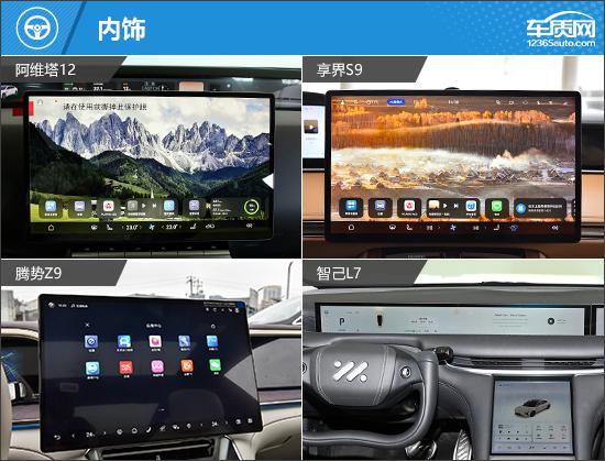 在内部配置方面,四款车都保持了较高的水平,没有一款车能占据绝对优势。阿维塔 12 配置 35.4 英尺贯穿式仪器,智己 L7 则是搭载了 26.3 10.5英寸中控屏, 中控下的英寸屏幕和 15.5 英尺副驾娱乐屏的组合,整体视觉效果十分震撼。腾势 Z9 最大的亮点是第二排座椅支持丰富的调节功能,享受世界 S9 由于部分调节功能需要通过选择才能获得,所以稍逊一筹。