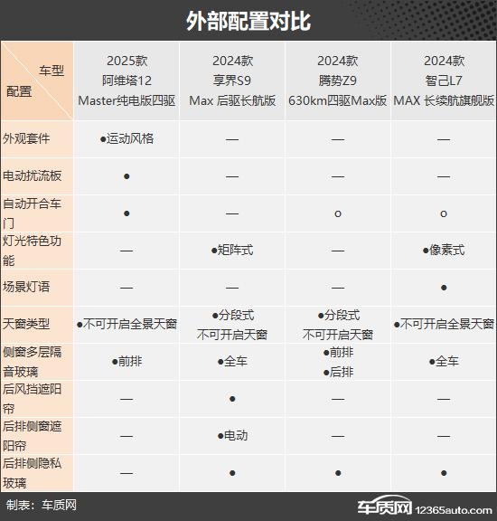 归根结底,四款车的产品定位都很高,所以基本的外部设备没有槽点,完全可以满足日常使用的需要。阿维塔 12 其亮点在于运动风格外观套件、电动尾翼和自动开闭门,显得相当酷炫时尚。腾势 Z9 和智己 L7 表现平淡无奇,后者的像素大灯支持情景灯语,可玩性较高。相比之下,享界 S9 最好的外部设备,不仅配备了矩阵 LED 大灯及整车侧窗多层隔音玻璃,并配有后挡风玻璃和后侧窗电动遮阳帘,尊贵感油然而生。
