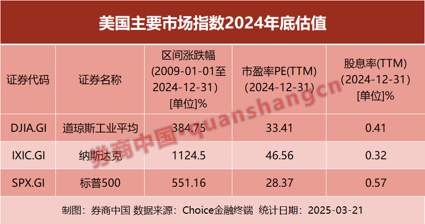 在经历了2000年初互联网泡沫后的10年熊市之后,美国股市从2009年开始了近15年的牛市,其估值在2024年底远远超过了历史平均水平。道琼斯工业平均指数等美国市场主要指数的动态市盈率是33.41倍,相应的股息率是0.41%。;与纳斯达克指数相对应的市盈率为46.56倍,股息率为0.32%。