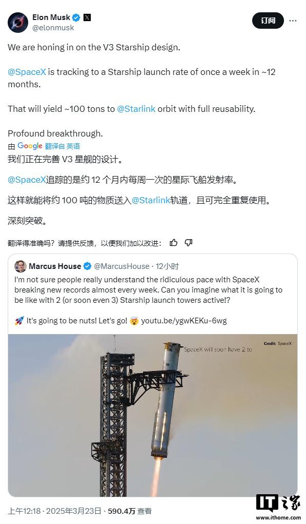IT 世家 3 月 23 日消息,SpaceX 创始人埃隆・社交平台上的马斯克 X 上一篇文章公布了公司星舰的进展情况,他指出正在完善。 V3 星际飞船版本设计,预计在约 12 星舰的发射频率将在几个月内达到每周一次。而且在完全可重复使用的前提下,每次可以预约。 100 一吨物资送到星链(Starlink)路轨。马斯克说这是一个很大的进步。