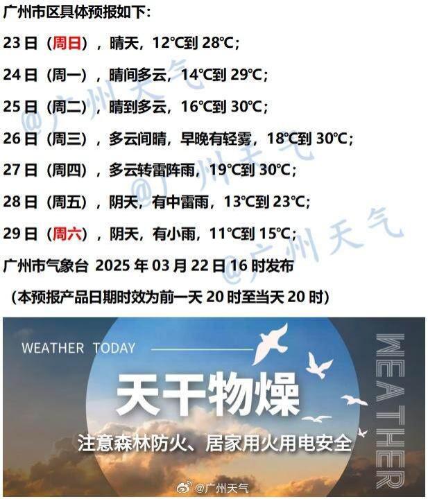 @据广州天气预测,未来几天阳光将继续在线,早晚天气清爽干燥,下周末雷雨将来袭。