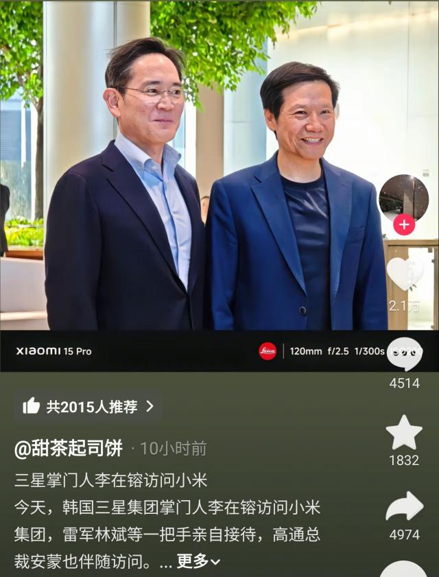 三星李在镕、高通安蒙被曝浏览小米汽车厂,雷军会见。