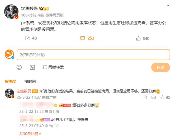 这位博主说,PC 现在系统优化的速度接近商业版本的状态,但是应用生态还要加快健全,基本办公需求还是没有问题的。