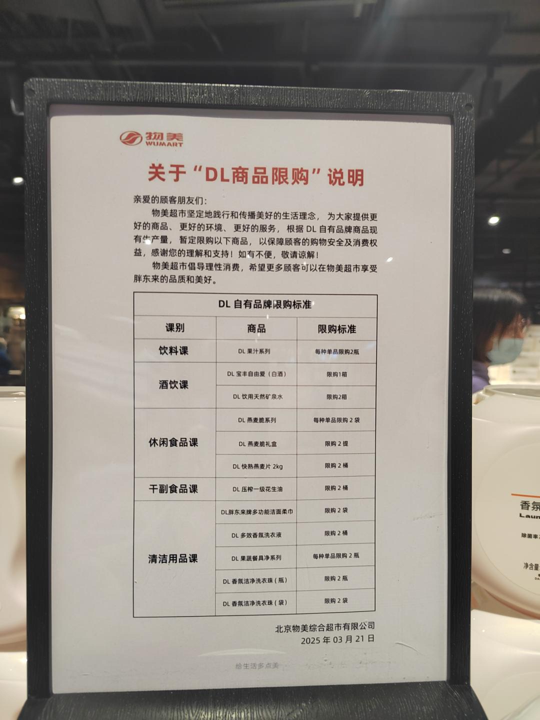 胖东来专区也是超市内人气最旺的区域之一,推着购物车甚至有点走不动路。现场张贴的告示牌表明,当前物美超市对“DL商品”实行严格限购。