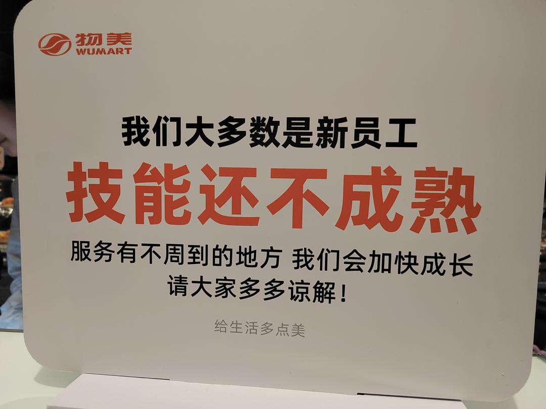 但胖物美确实学会了导师面向消费者时的谦卑态度,超市里四处竖着“道歉牌”。