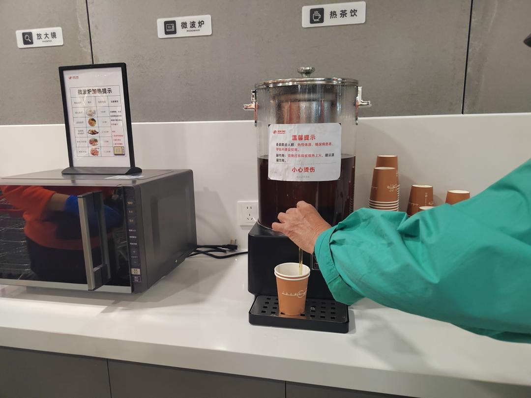 在超市门外,胖物美预留出一排靠墙的区域作为用户服务区,提供免费红糖姜茶、医药箱、血压检测仪、洗手池等。其中,血压检测仪和红糖姜茶最受欢迎,老年人排队给自己测血压,穿着橙色工作服的工作人员则向不断向往来的消费者介绍免费饮品。
