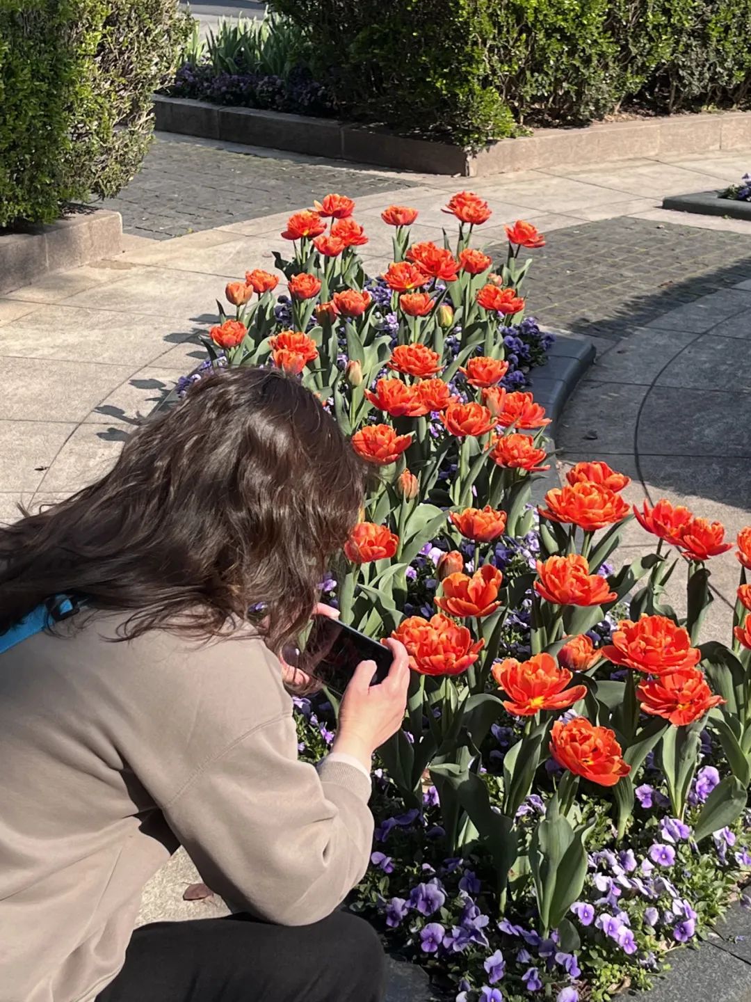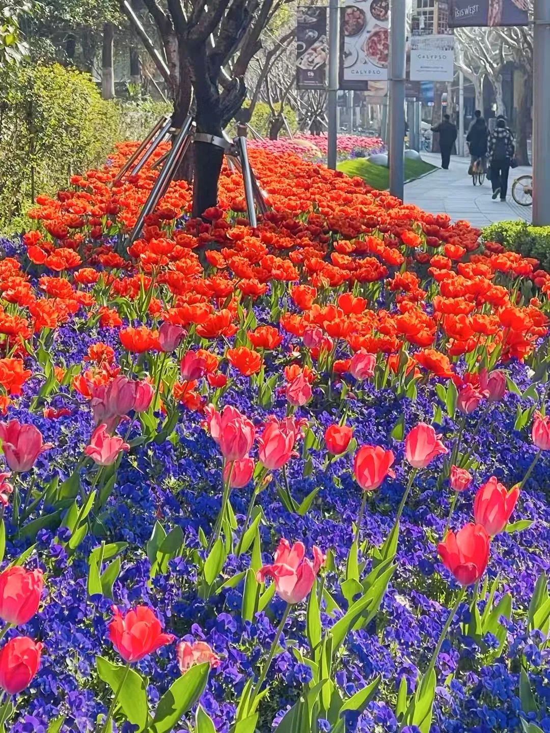 延安中路嘉里中心门口绿化了各种郁金香。橙色和粉色的重瓣像女孩重叠的裙子。“幸福一代”的红白单瓣在阳光下散发出丝绸般的光泽,日常生活中罕见品种的“神秘火焰”温暖耀眼...