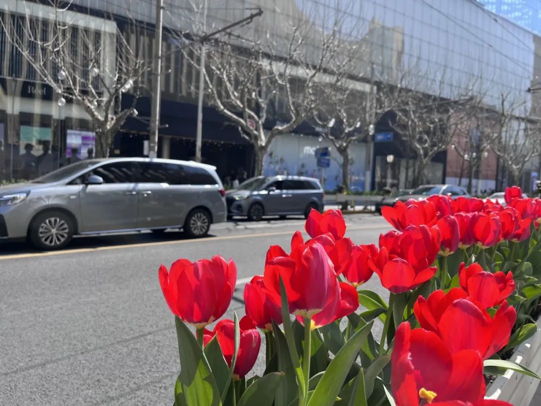 久光百货与瑞欧百货之间,车水马龙反映出郁金香在街头的迷人身姿,城市街景与自然春色交融。