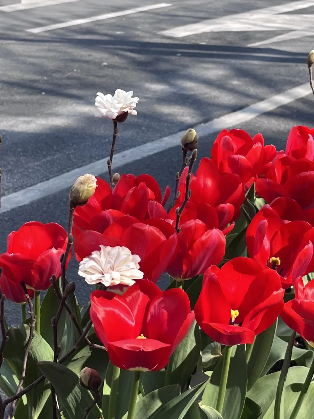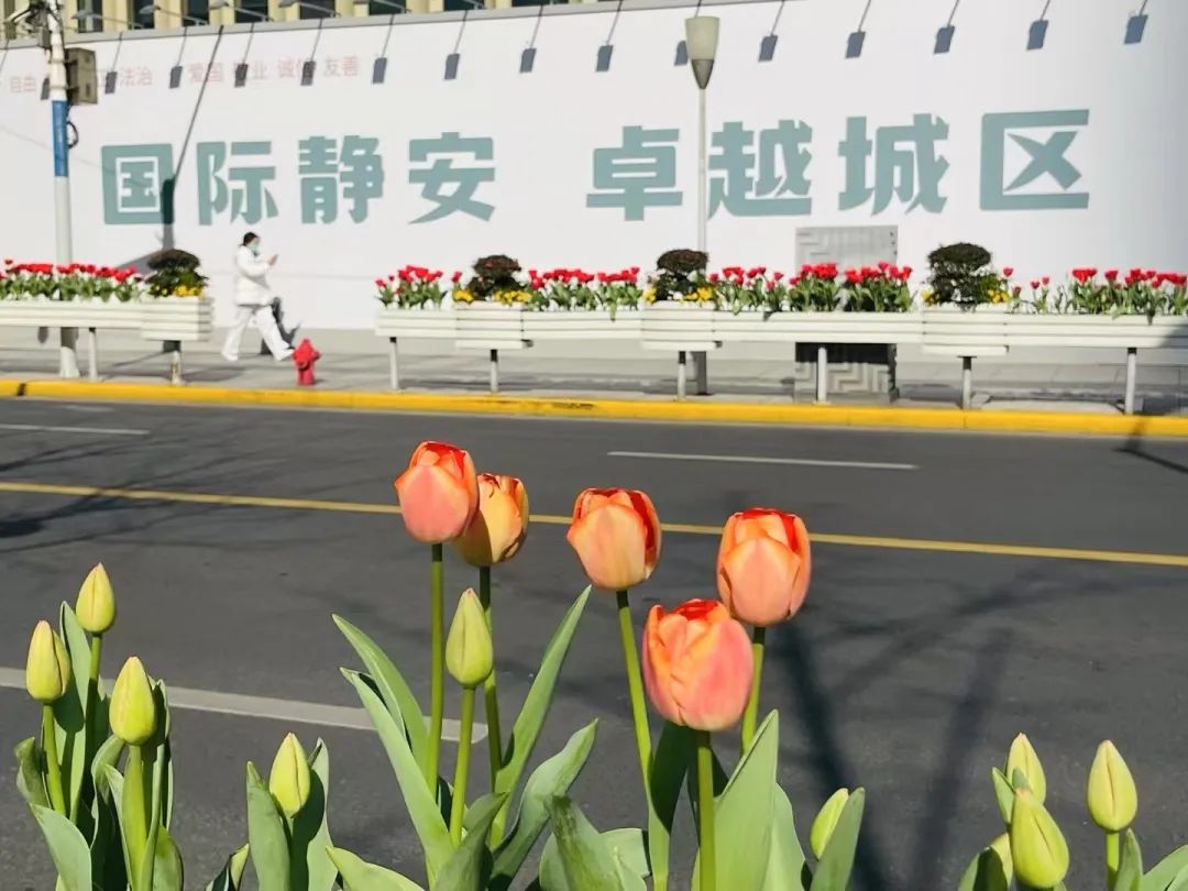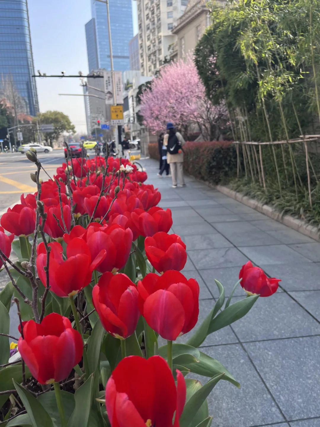红郁金香和矮枝玉兰在常德路花箱里盛开,将街道晕染成丝绒画廊,迎接春天。