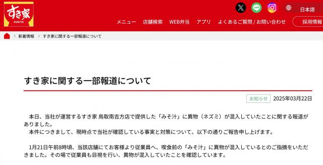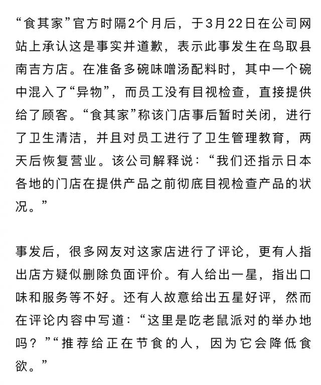 日本著名连锁餐厅“食其家”官方承认,顾客此前投诉在味噌汤中发现老鼠尸体是真的。。解释说是因为员工在提供产品之前没有检查,然后店铺关闭了两天进行卫生检查和培训。然而,日本网民认为商店的态度非常不真诚。