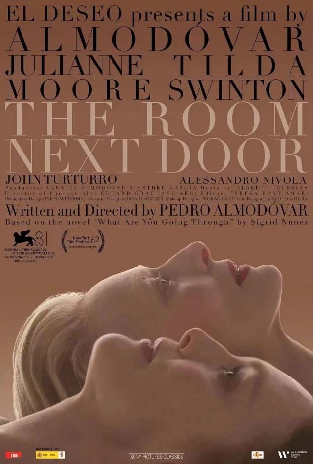 佩德罗是《隔壁房间》 · 第一部由阿莫多瓦执导的英文电影,讲述了两个朋友面对生命和死亡时的深情故事。朱丽安是u200c的女主人。 · 摩尔和蒂尔达 · 由西格丽德改编的斯文顿领导。 · 努涅斯的小说《你在经历什么》。此片于 2024 年 9 月 2 第一次在威尼斯电影节上播出,获得第一次。 81 金狮奖是威尼斯电影节主竞赛单元的最佳电影。
